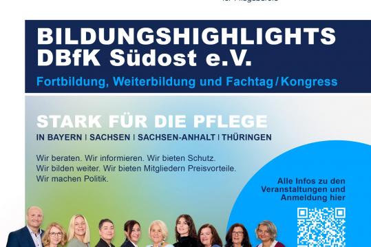 Mit einer ganzen Reihe berufspolitischer Themen prägt der DBfK Südost die Veranstaltung: Südost-Vorsitzende Dr. Sabine Berninger diskutiert mit Franziska Böhler und Sabine Brase über das Pflegekompetenzgesetz und dessen Schicksal angesichts aktueller politischer Entwicklungen. DBfK-Präsidentin Vera Lux referiert über Advanced Practice Nursing und Community Health Nursing. Und Christiane Lehmacher-Dubberke, Geschäftsführerin im DBfK Südost, informiert über die Notwendigkeit intersektoraler Versorgung, um die Zusammenarbeit zwischen den Gesundheitssektoren zu fördern und die Patient:innenversorgung zu optimieren. Dazu kommen viele weitere Referent:innen aus ganz Deutschland nach Augsburg, z. B. Jeannine Fasold, Vanessa Schulte und Tanja Gebauer.
